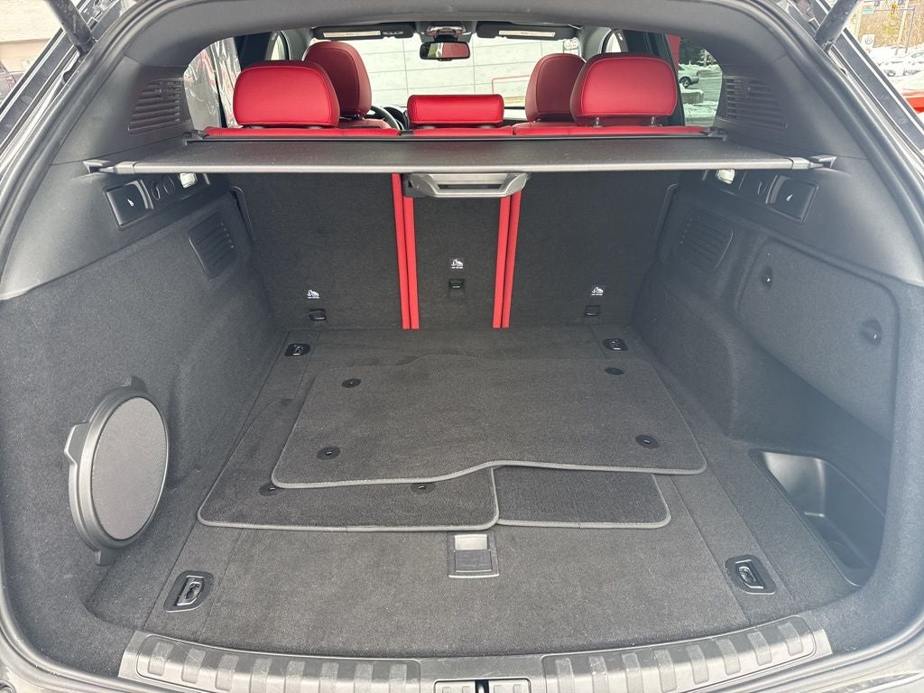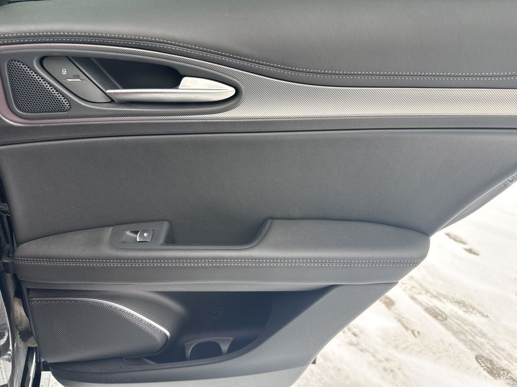 The Stelvio Veloce's striking Vulcano Black Metallic exterior and sleek, sporty lines turn heads wherever it goes. Step inside and you'll be greeted by a premium cabin adorned with luxurious red leather sport seats, genuine wood accents, and a harman/kardon premium audio system that will elevate your listening experience.